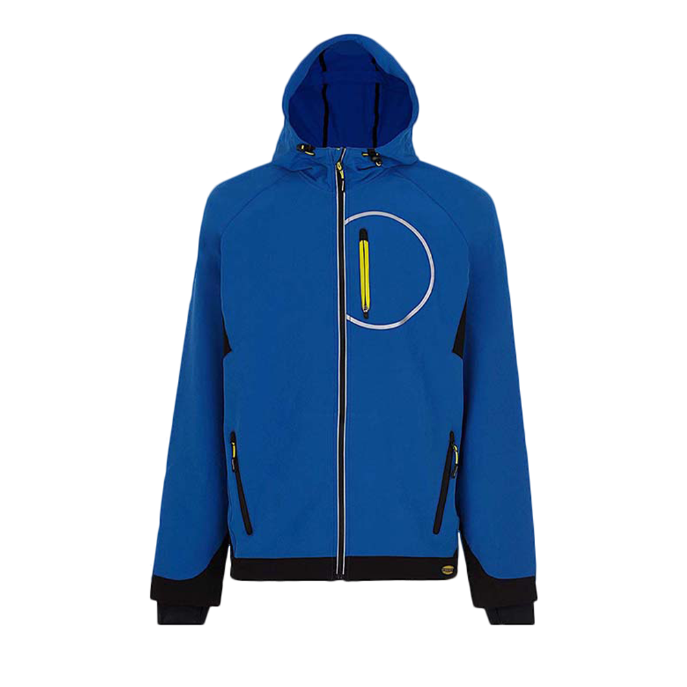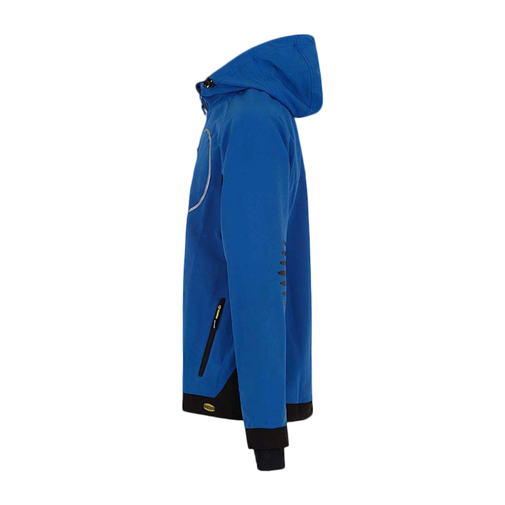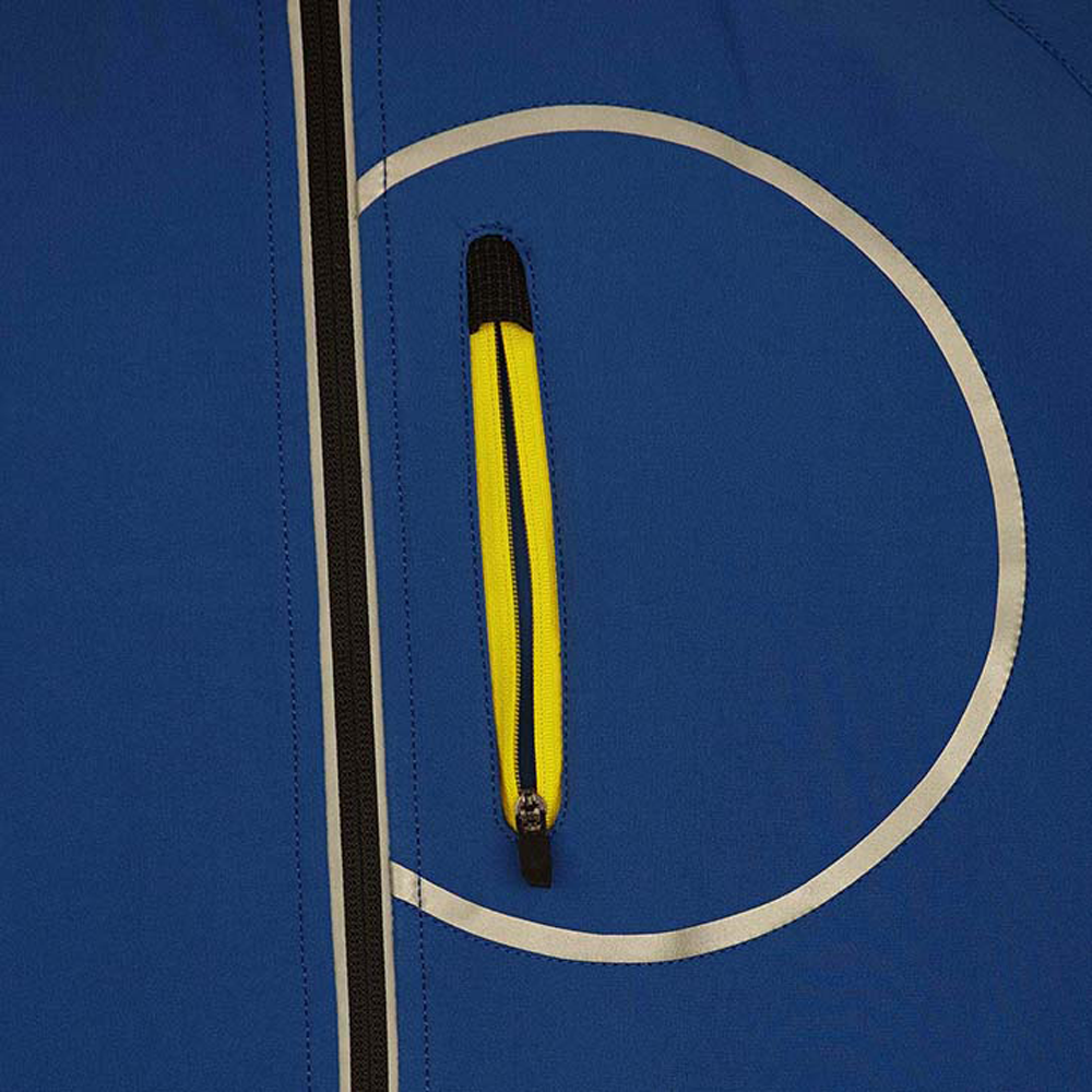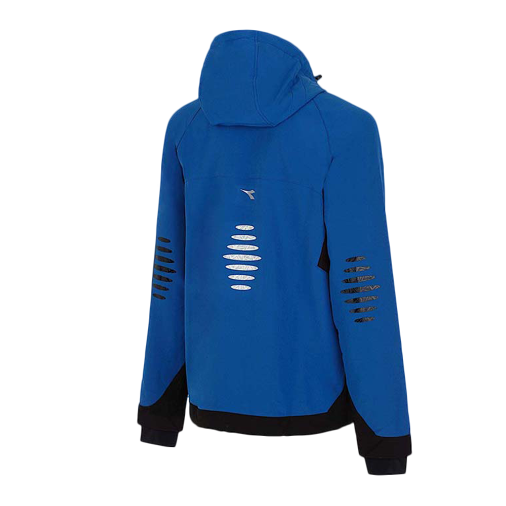 Jest w jednolitym niebieskim kolorze. Dół kurtki Diadora TRAIL został wykończony kontrastowym materiałem w kolorze czarnym. Przy zamkach i kieszeniach zostały wkomponowane drobne wstawki z jaskrawego żółtego koloru. Natomiast na plecach zostały umieszczone fotoluminescencyjne elementy D-BRIGHT.