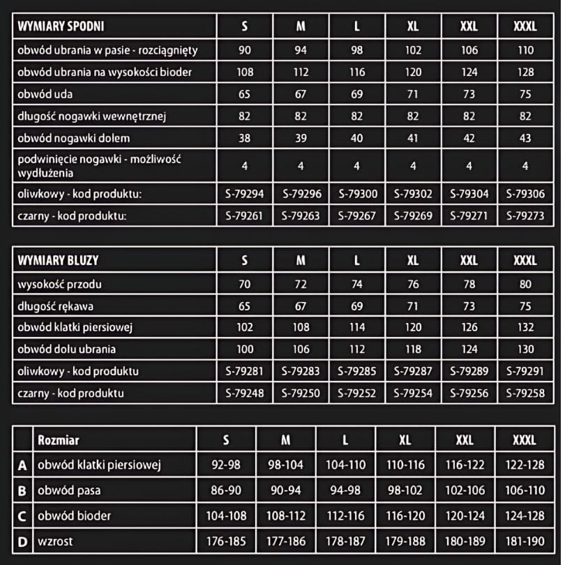 - Nogawki: zakończone gumką ze stoperem