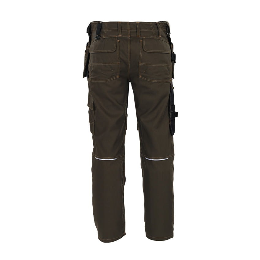 Spodnie robocze o obniżonej, dopasowanej tali, osiadają ergonomiczny kształt nogawek, zapewniający swobodę ruchów. Posiadają kieszenie na kolanach na nakolanniki, wzmocnione tkaniną CORDURA®. Kieszenie dodatkowo zabezpieczone są klapką dzięki czemu nie dostaje się do niech brud. Dodatkową widoczność po zmroku zapewniają paski refleksyjne.