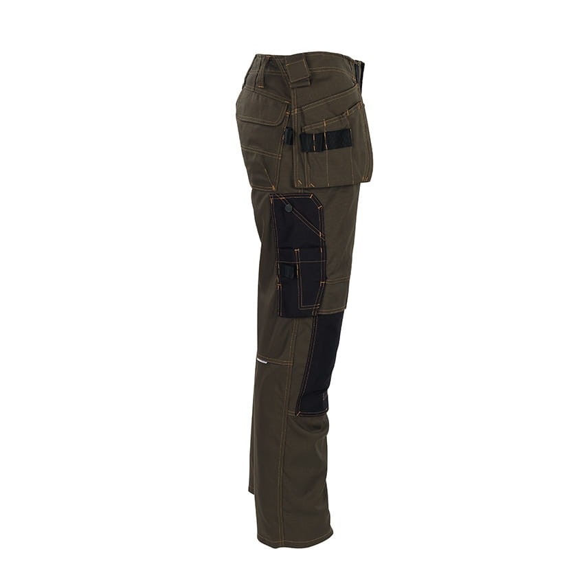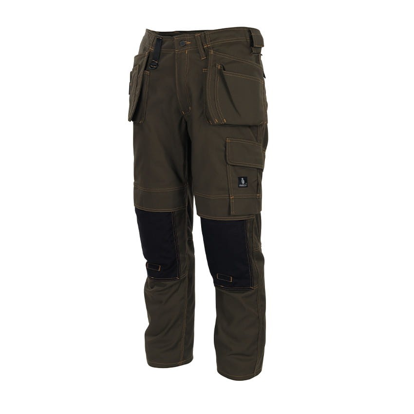 Almada 06231-010-19 to ciemno oliwkowe spodnie robocze. Zostały wyprodukowane przez firmę Mascot, znanego producenta odzieży roboczej. Wykonane z są wysokiej jakości tkaniny poliestrowej posiadającej certyfikat Oeko-Tex® Standard 100. Ergonomiczny krój nogawek zapewnia dużą swobodę ruchów. Funkcjonalne, dodatkowo wzmacniane kieszenie to dodatkowy atut tych spodni. Posiadają kieszenie na nakolanniki wzmacniane CORDURA®.